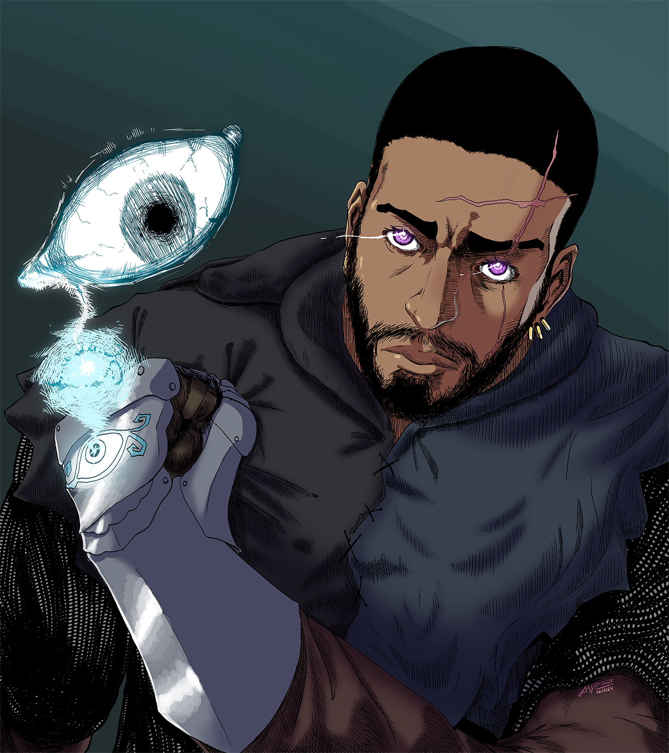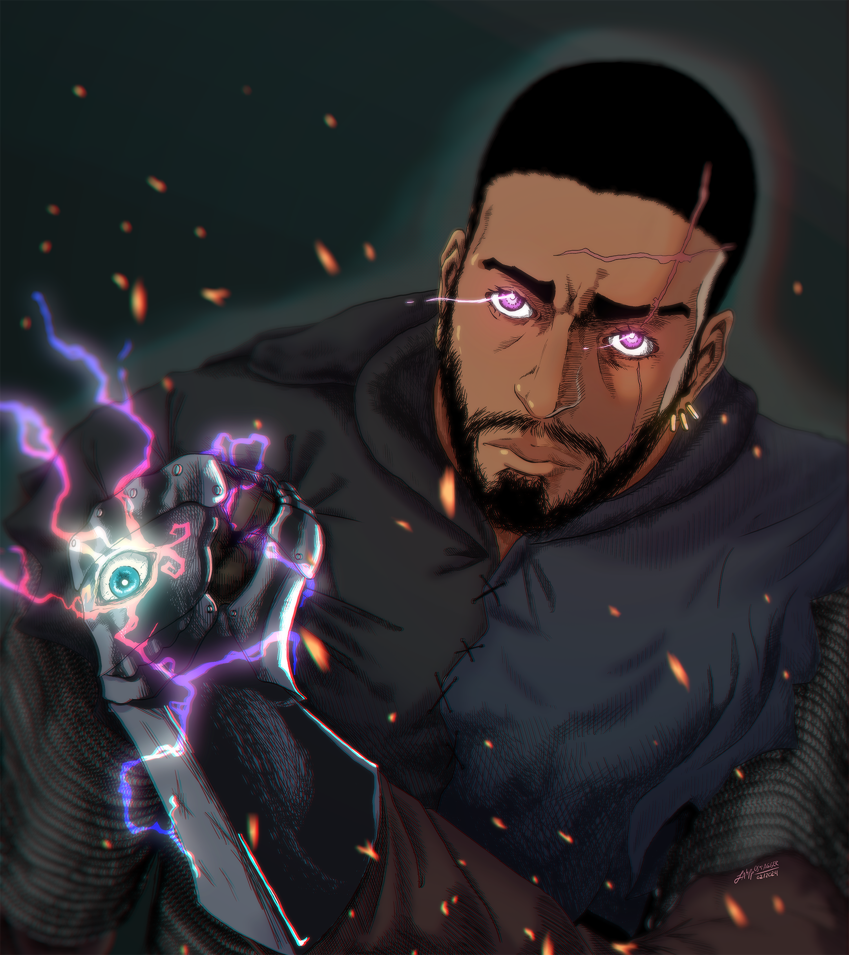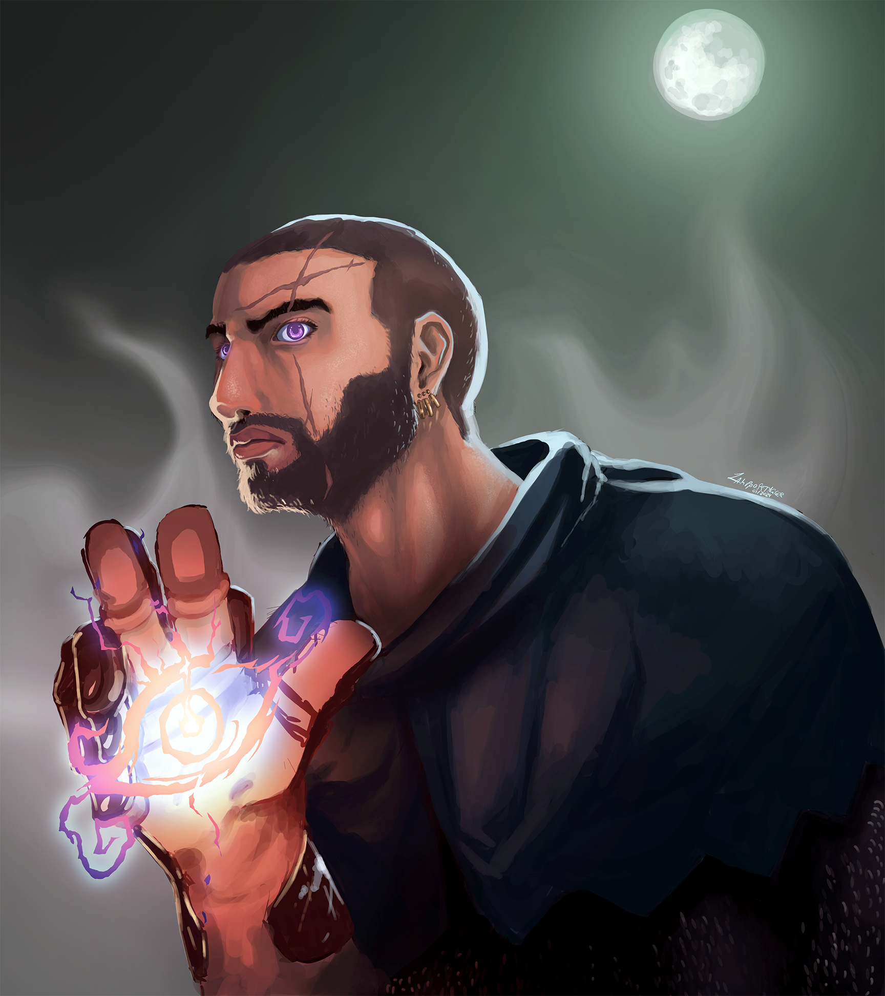 Major characteristics: Dark-short buzzcut, light olive skin, eyes of Wisteria colour that glow due their “Eyes of Night” feature, holy symbol of Helm on his left gauntlet (which becomes alive among twilit lightnings when he casts a spell), blue-black surcoat of Helm’s Hold’s city watch.