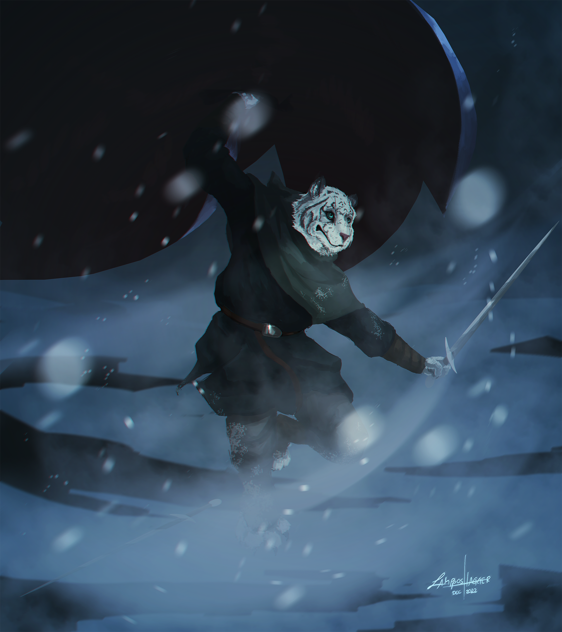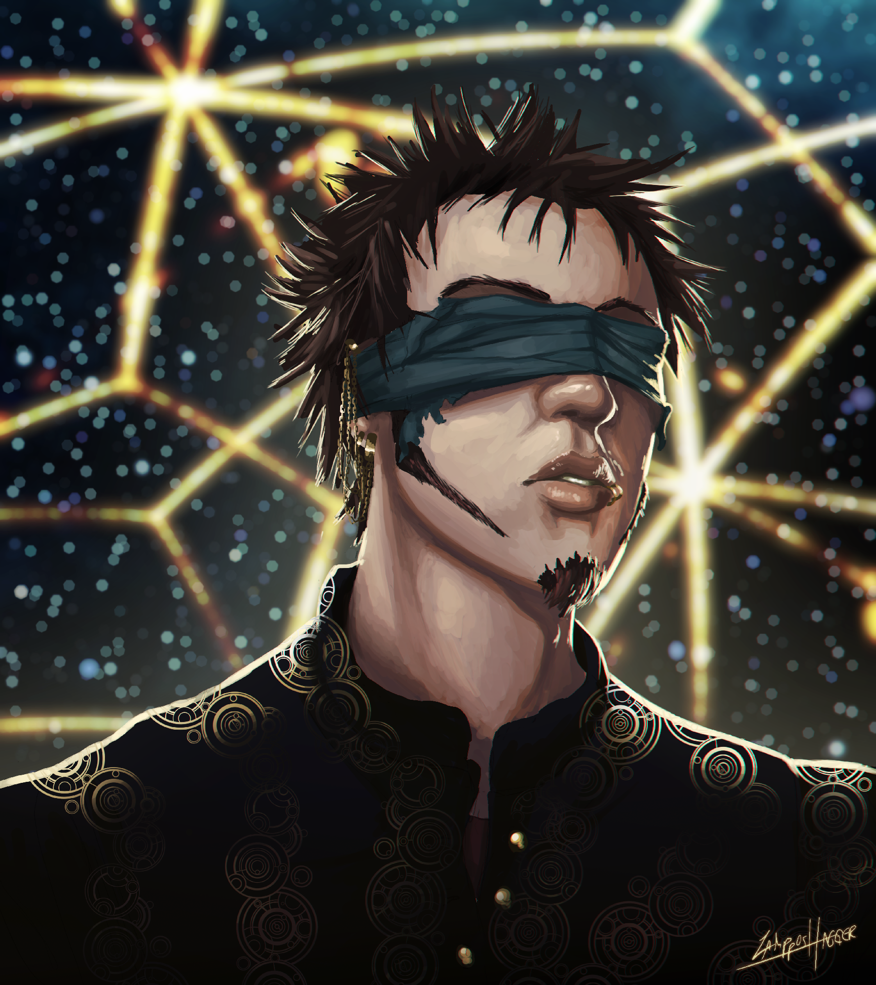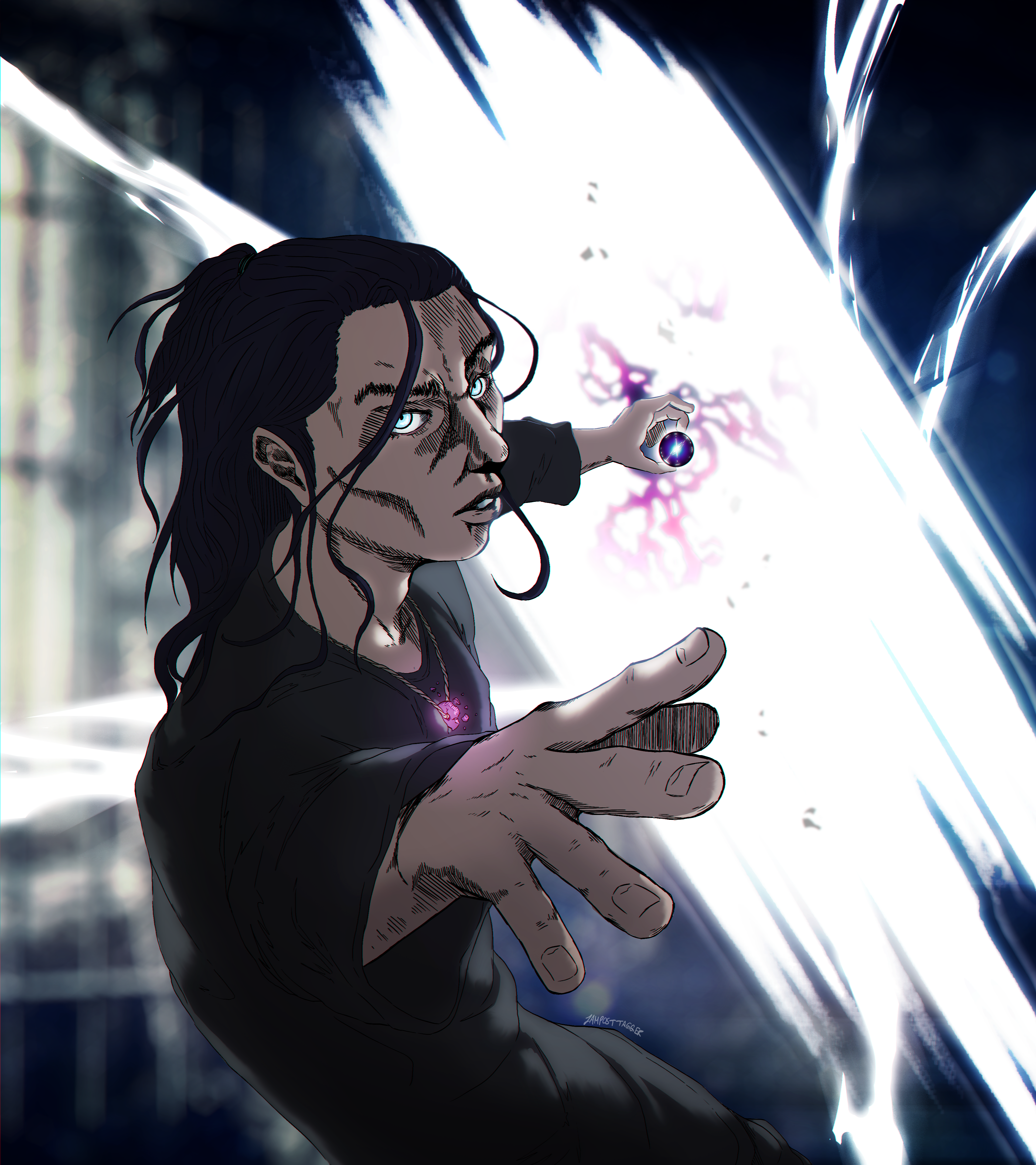 Major characteristics: Dark-short buzzcut, light olive skin, eyes of Wisteria colour that glow due their “Eyes of Night” feature, holy symbol of Helm on his left gauntlet (which becomes alive among twilit lightnings when he casts a spell), blue-black surcoat of Helm’s Hold’s city watch.
