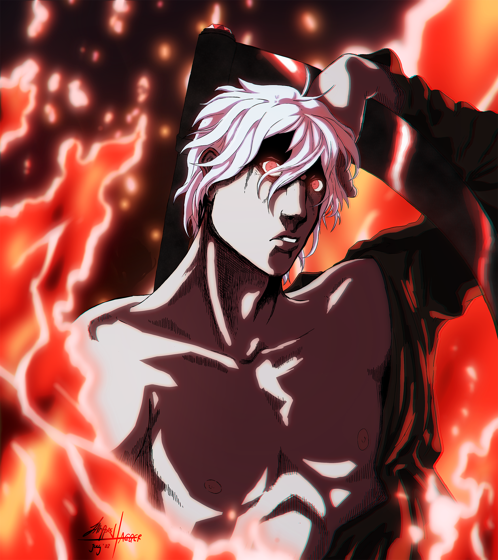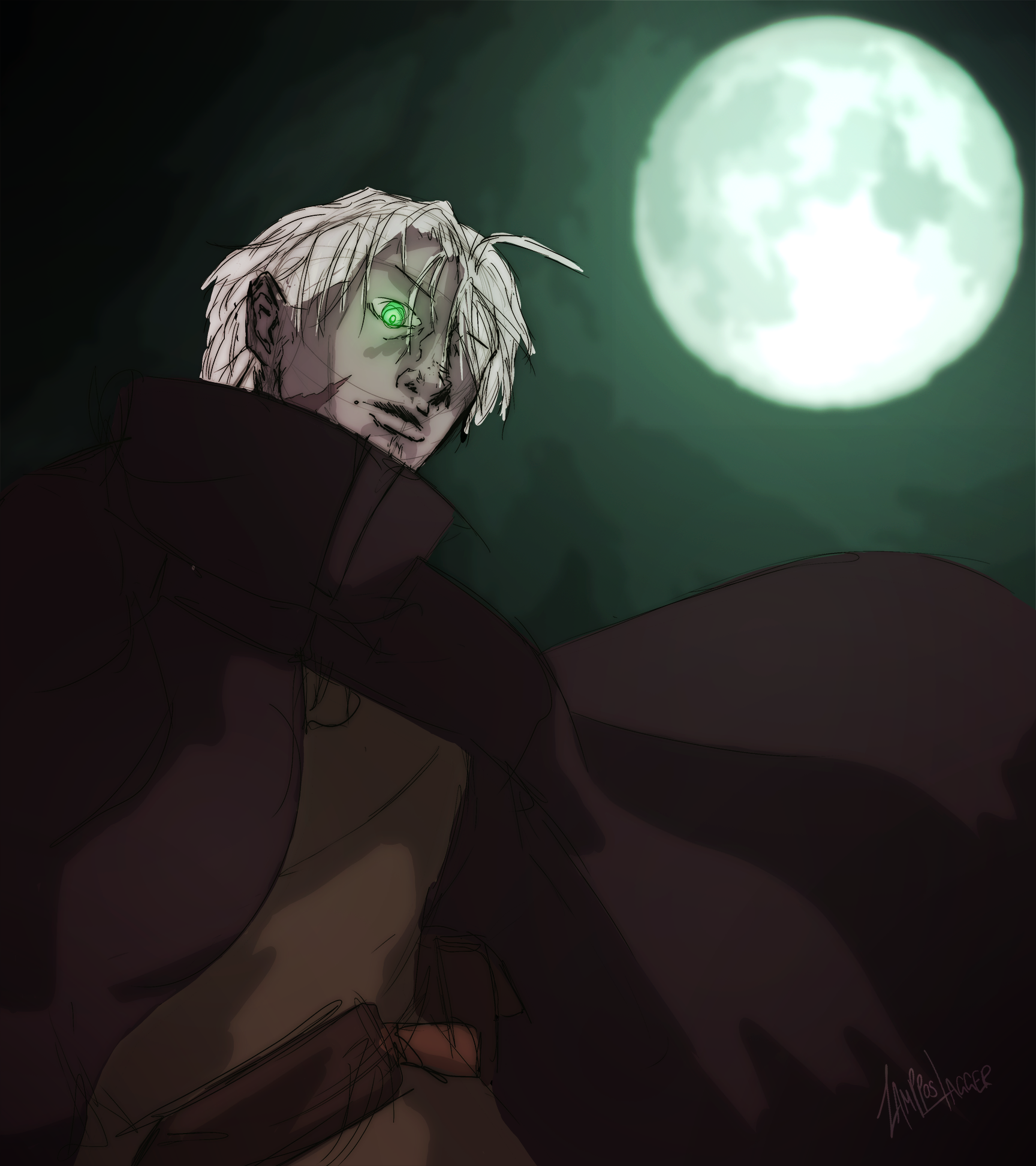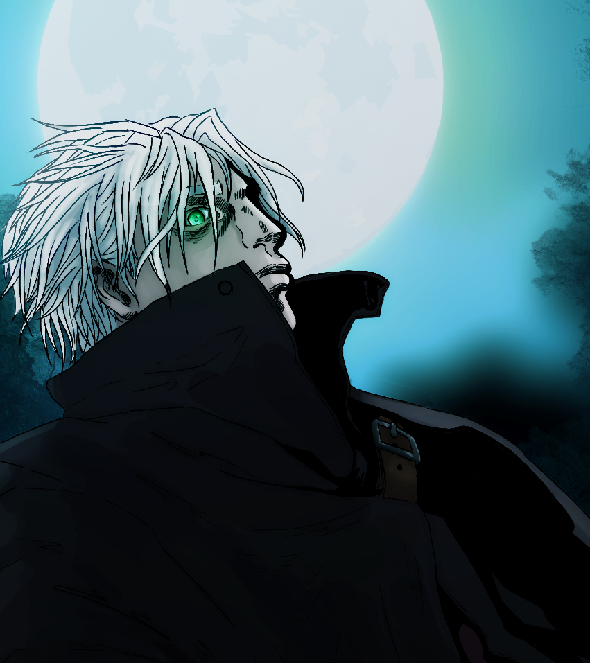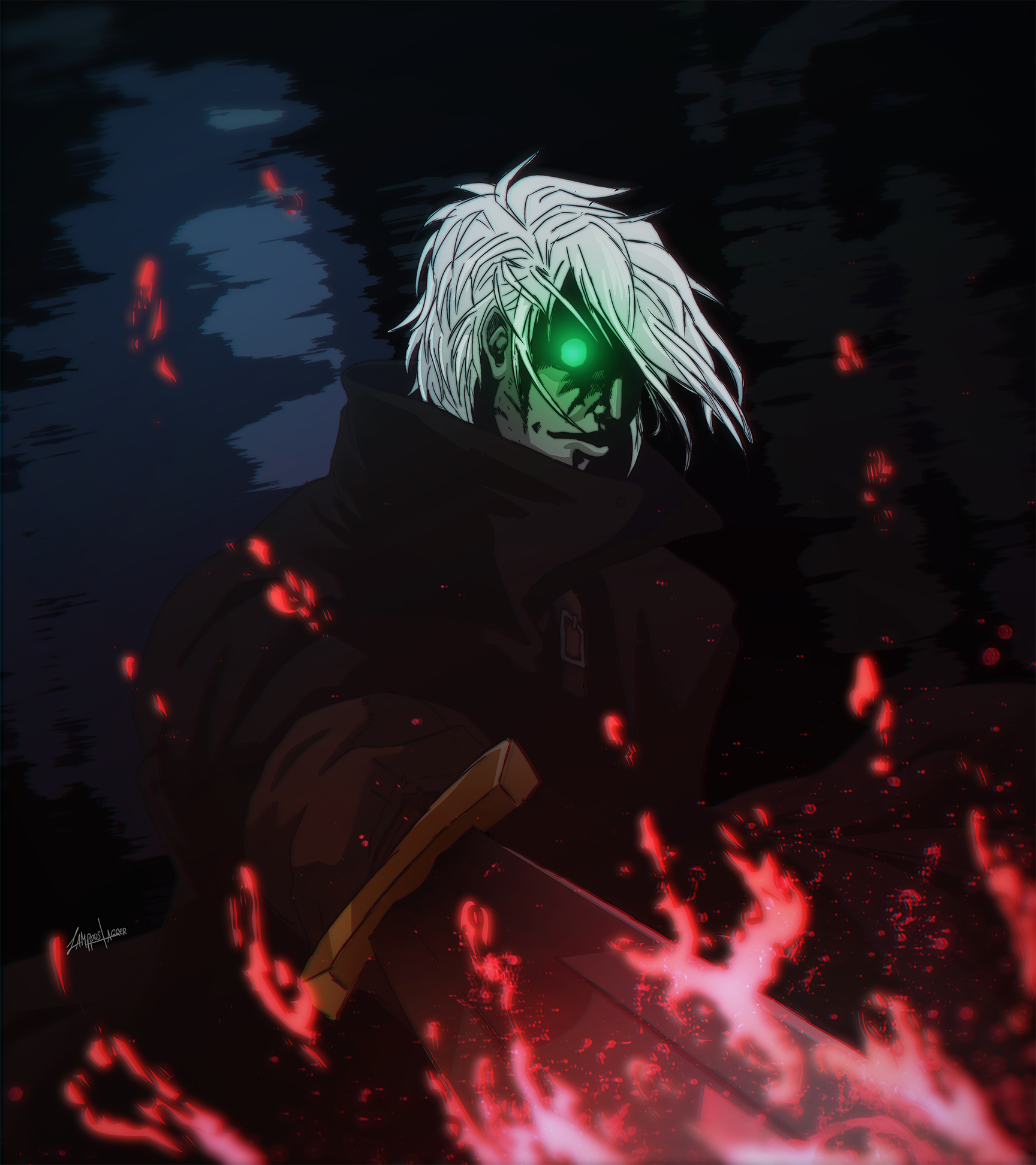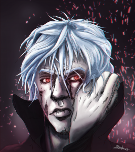 Major characteristics: White-silverish hair, pale (‘coz undead), emerald green eyes that can turn crimson, crimson flames, long coat with high collar