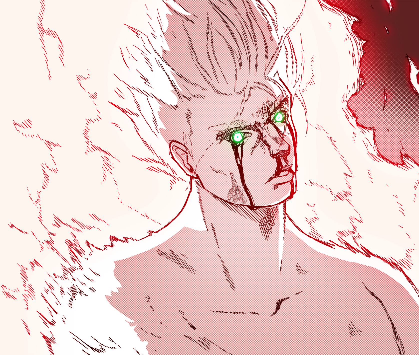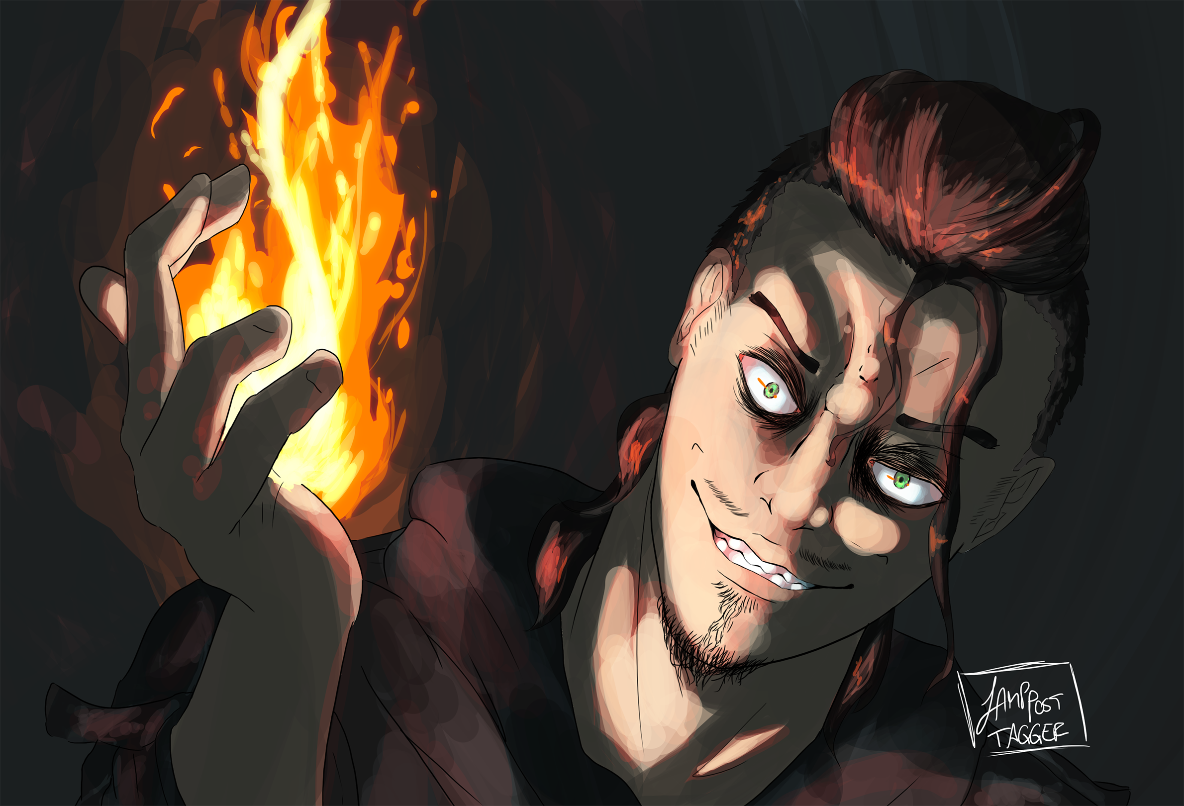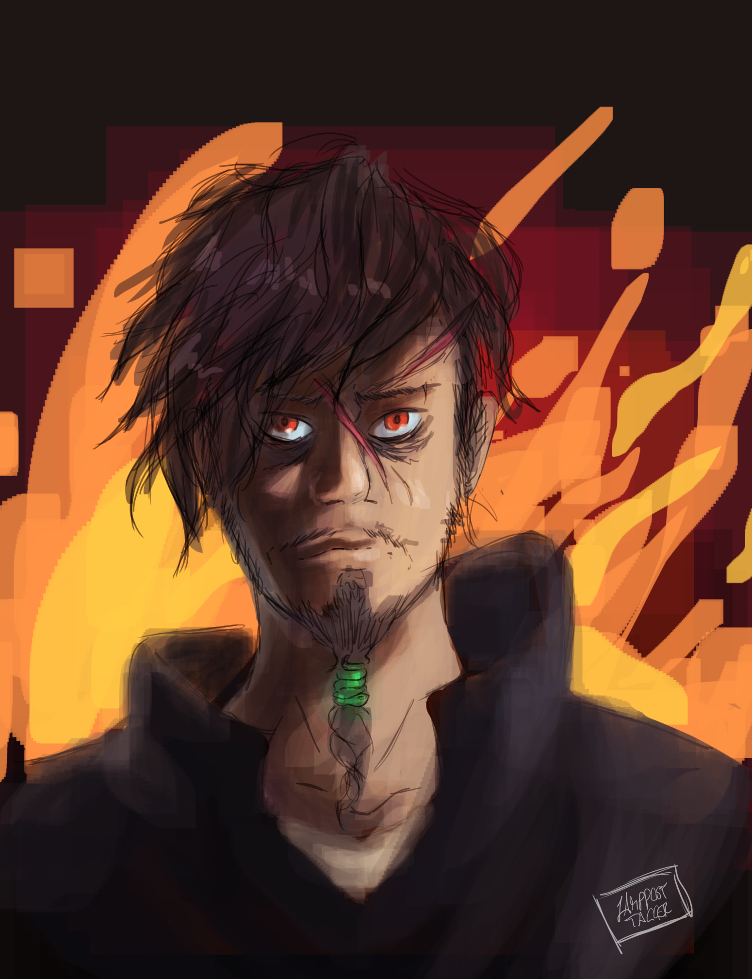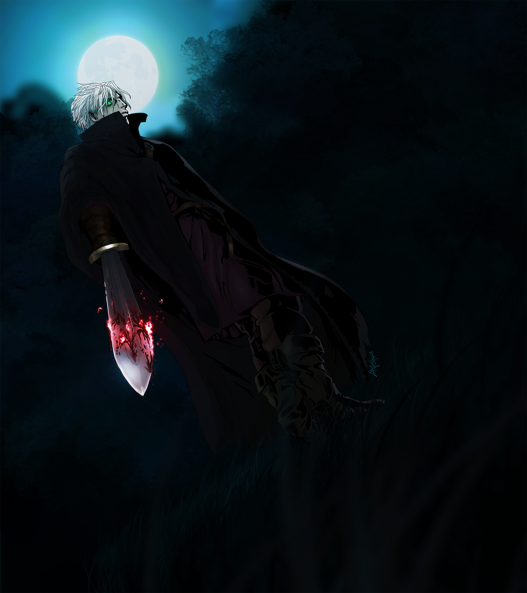 Major characteristics: White-silverish hair, pale (‘coz undead), emerald green eyes that can turn crimson, crimson flames, long coat with high collar