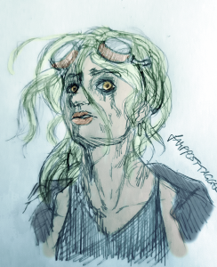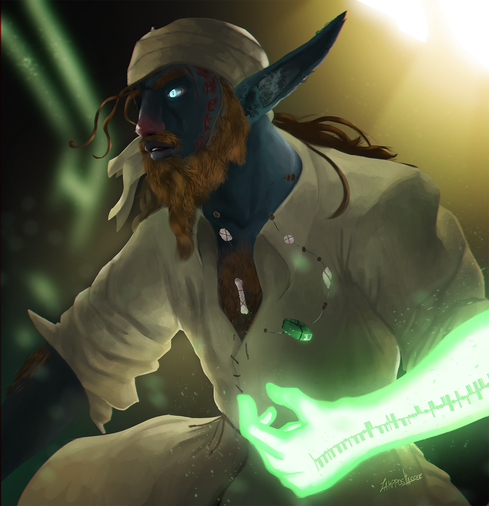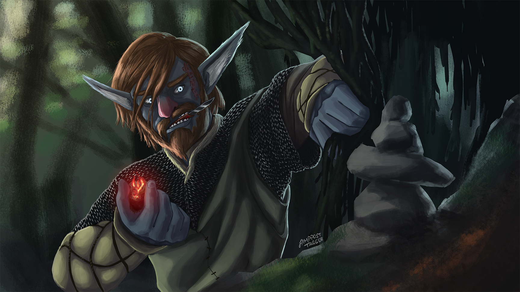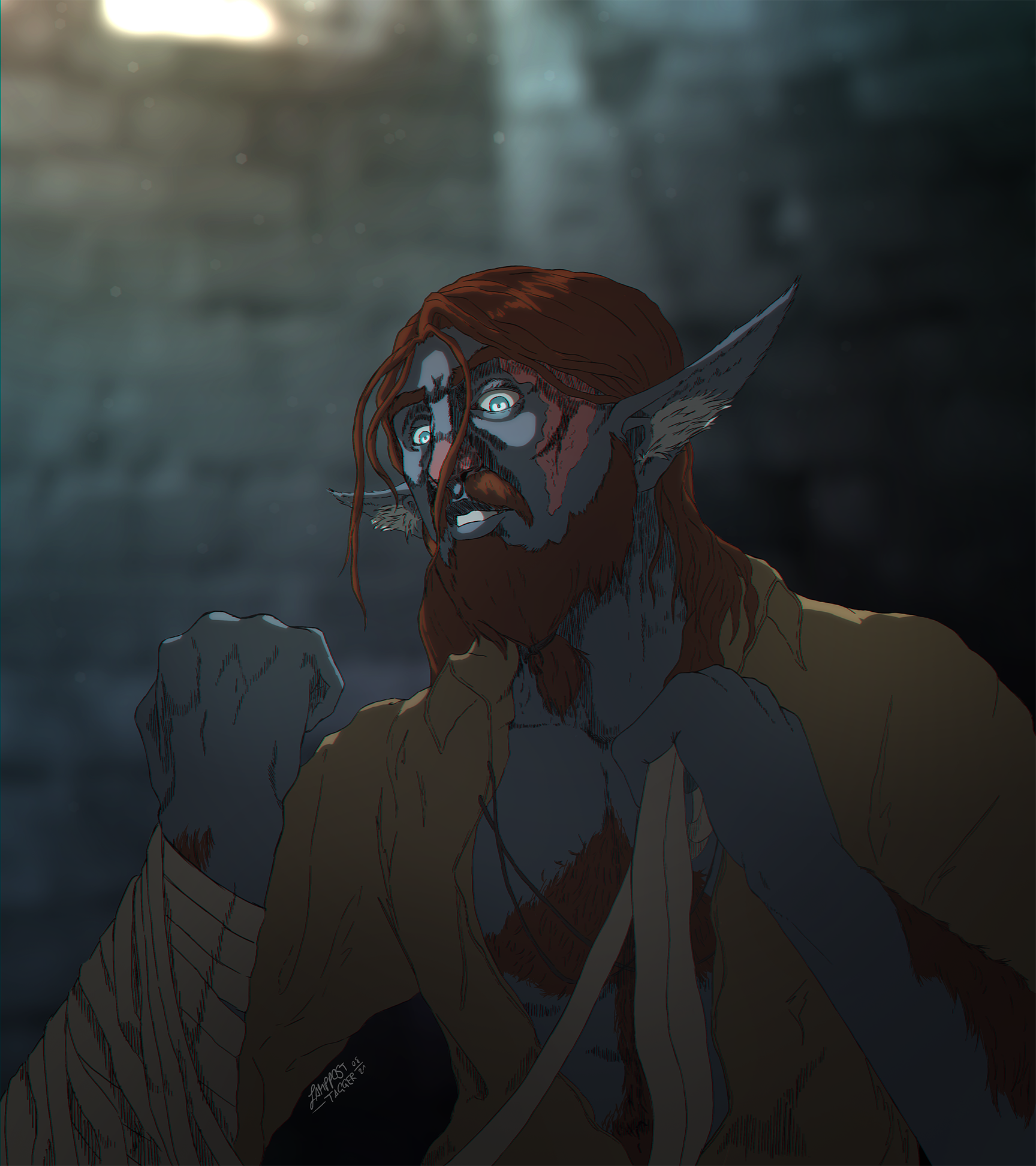 Major characteristics: Fiery-red hair, icy-blue eyes, blue-pinkish skin, glyphs scars left on his face (from his sight), since recently he also has a ogham tattoo as druidic focus saying “An solas, an saol, an neart, an fómhar, an buíoch” inspired by the Eluveitie song “Elembivos” (→ Here on YouTube).